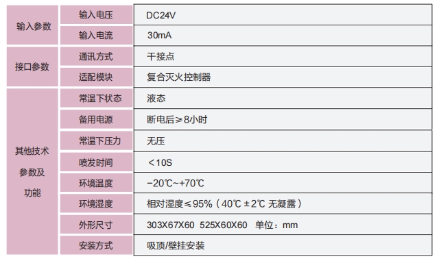 灭火装置采用专用的高效灭火试剂-全氟己酮,当复合灭火控制器检测到烟雾浓度、温度按照设定的触发条件同时报警时,会向预制式全氟己酮灭火装置发出启动命令,预制式全氟己酮灭火装置接收命令后会立即启动,高压气体会在10S内喷出,迅速降低空间内的温度和氧含量,在火灾产生极早期抑制、扑灭火灾。